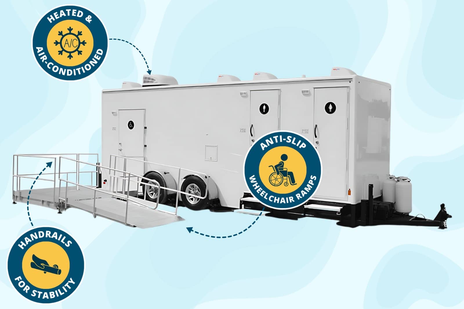 Our ADA restroom trailers provide safe, compliant, and comfortable sanitation for all guests and workers. Designed to meet or exceed Americans with Disabilities Act guidelines, these units ensure everyone has access to clean and private facilities.